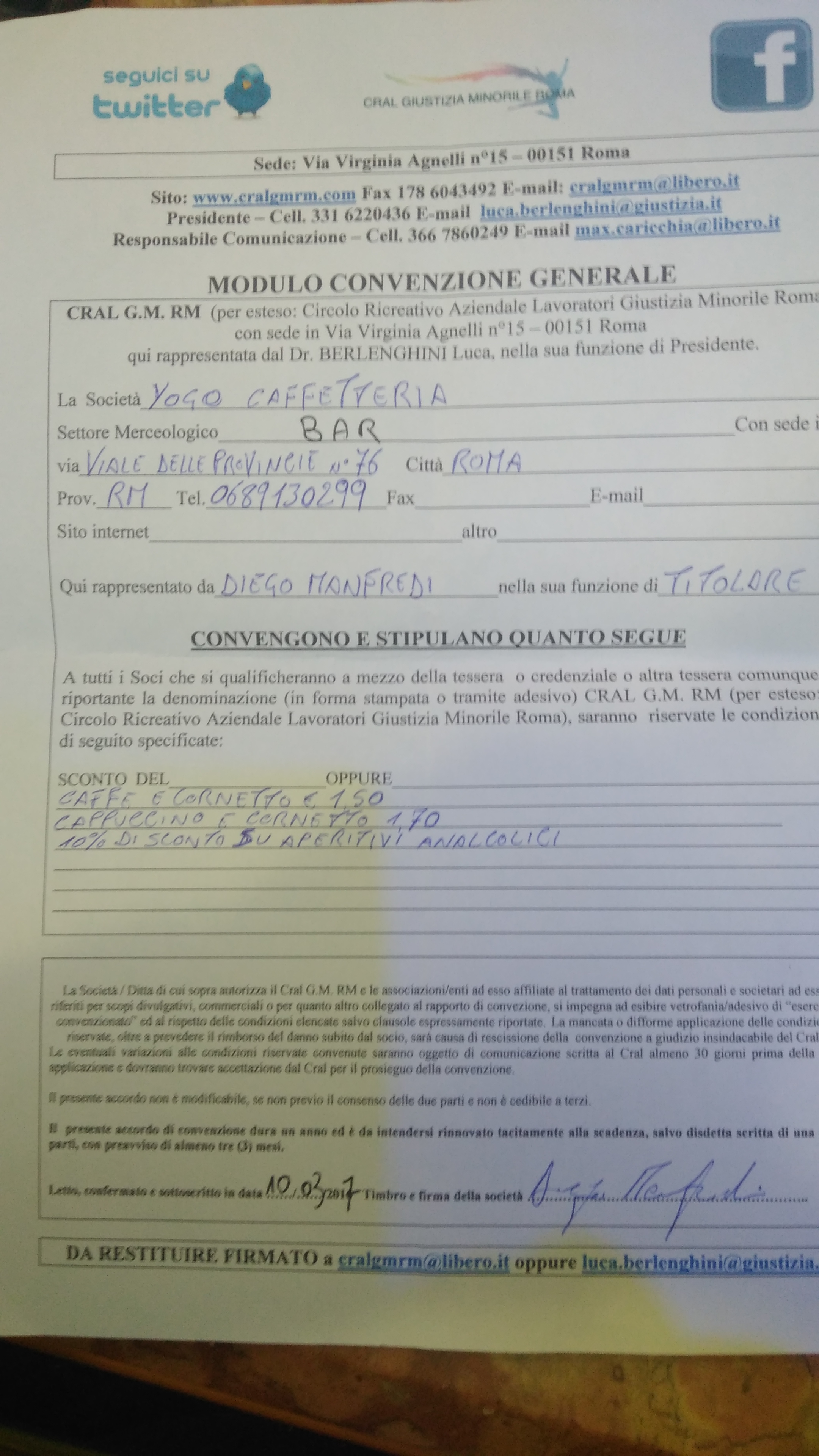 Yogo Caffetteria Bar: Viale delle Provincie, 76 – 00162 Roma. Il bar (tel. 06.89130299) ha accordato a tutti gli iscritti al Cral Giustizia Minorile le seguenti condizioni (allegato pdf):