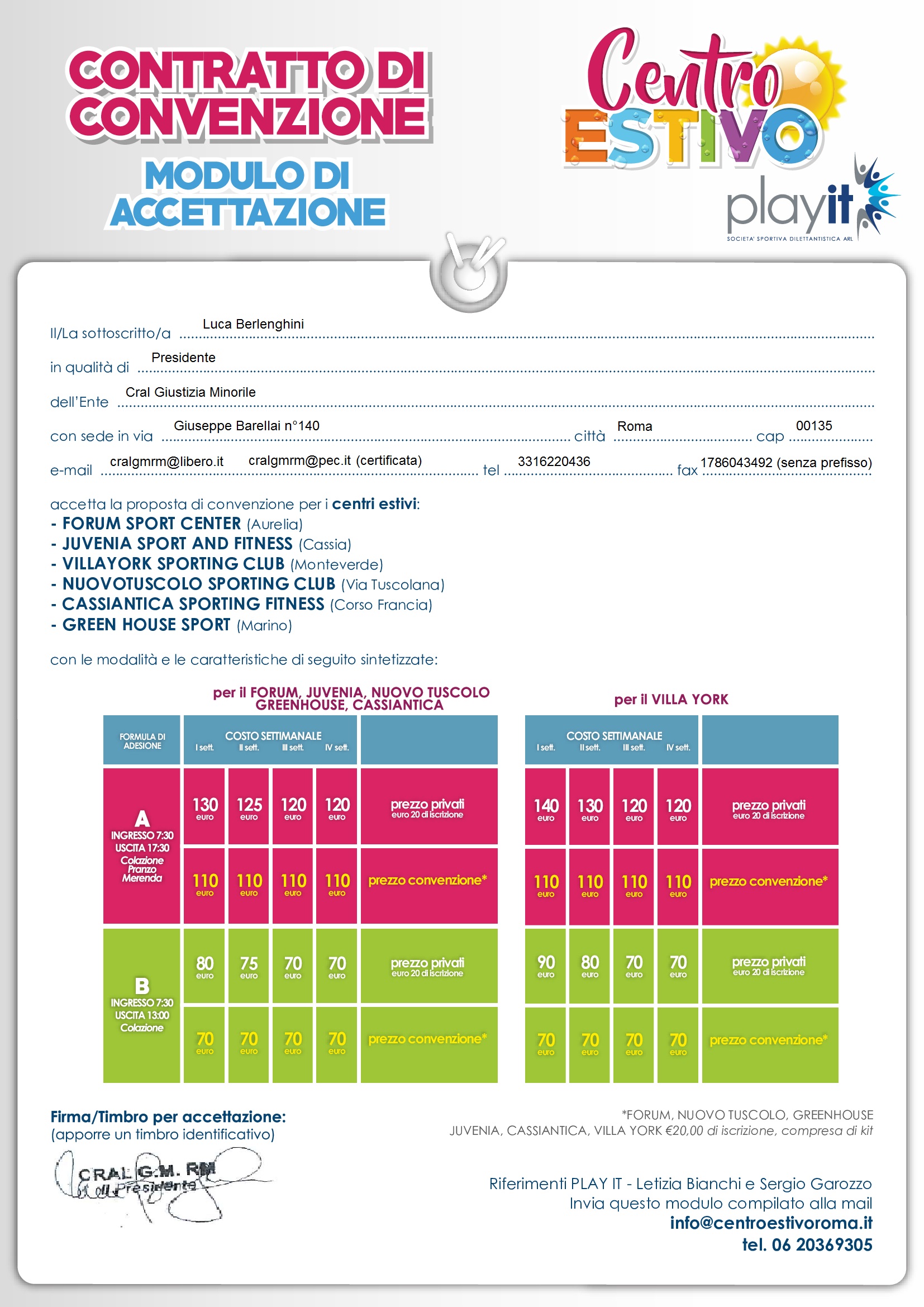 Centro Estivo Roma (PLAY IT): tel. 06.20369305. La Referente è la Sig.ra Letizia Bianchi. Annunciamo a tutti i soci del Cral Giustizia Minorile un’importante convenzione (visibile a questo link) che prevede tantissimi vantaggi (si veda sottoscrizione). Strutture convenzionate: